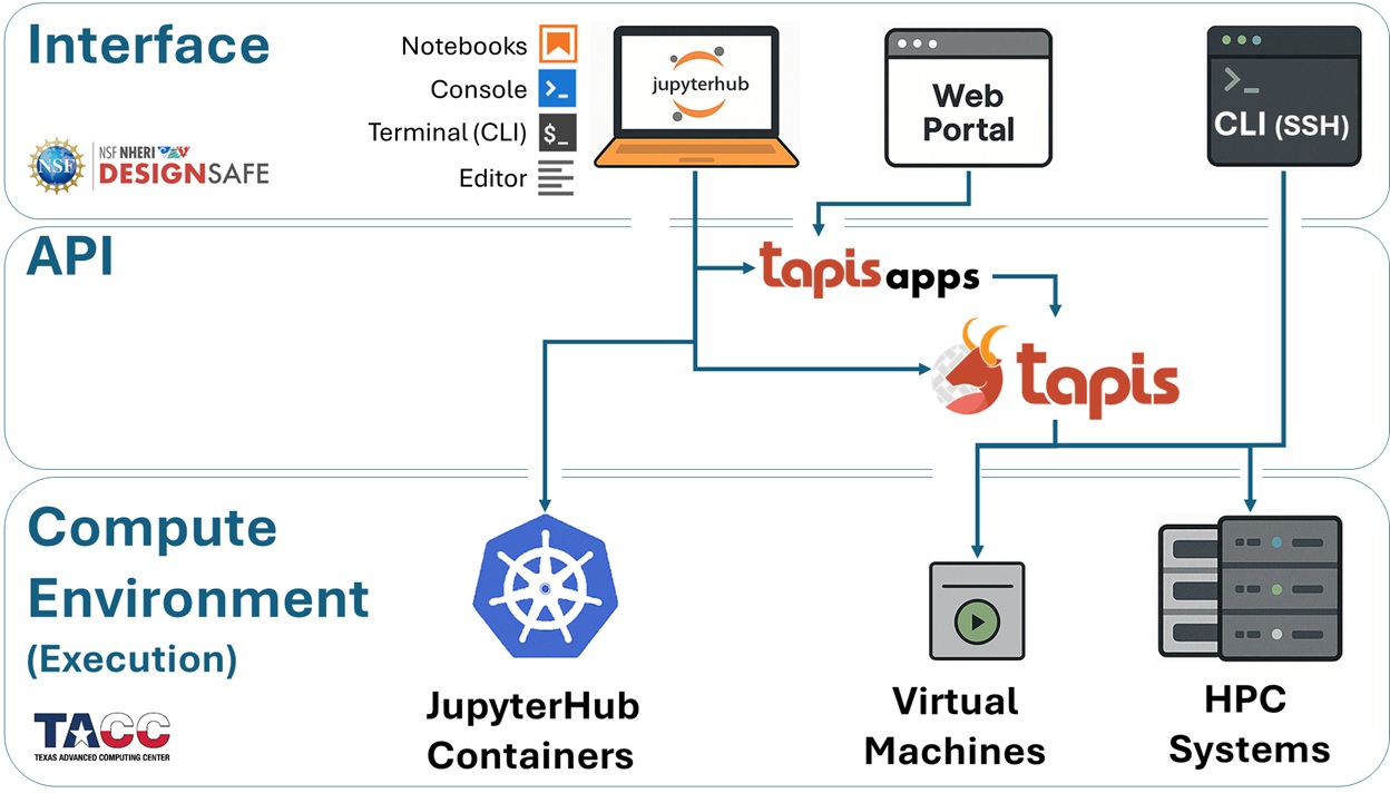 Between interfaces and execution environments sits the middleware layer, provided on DesignSafe by the Tapis API.