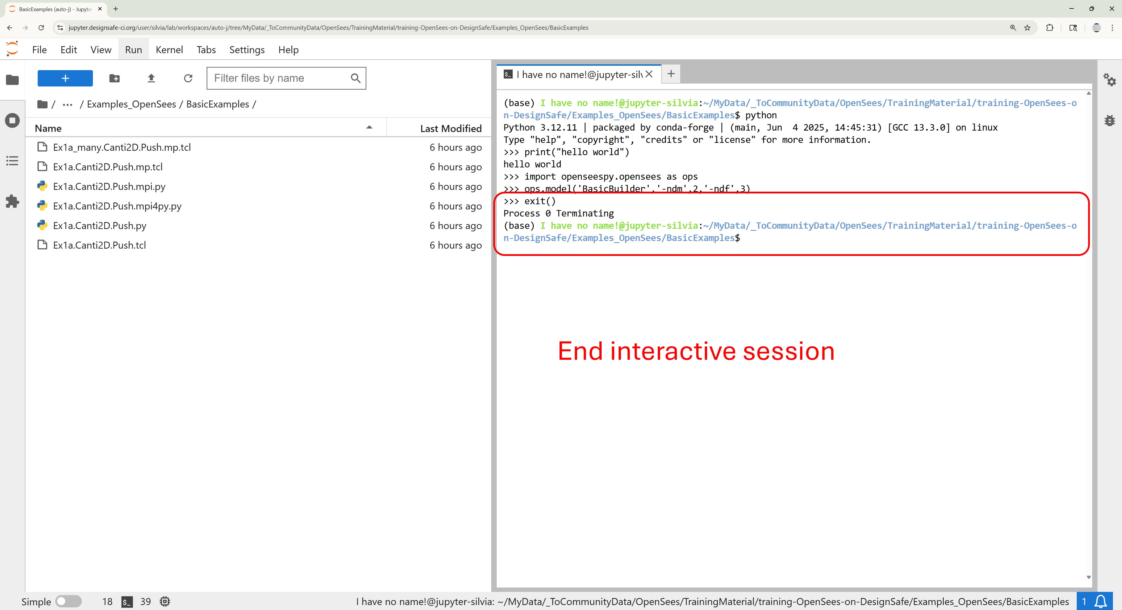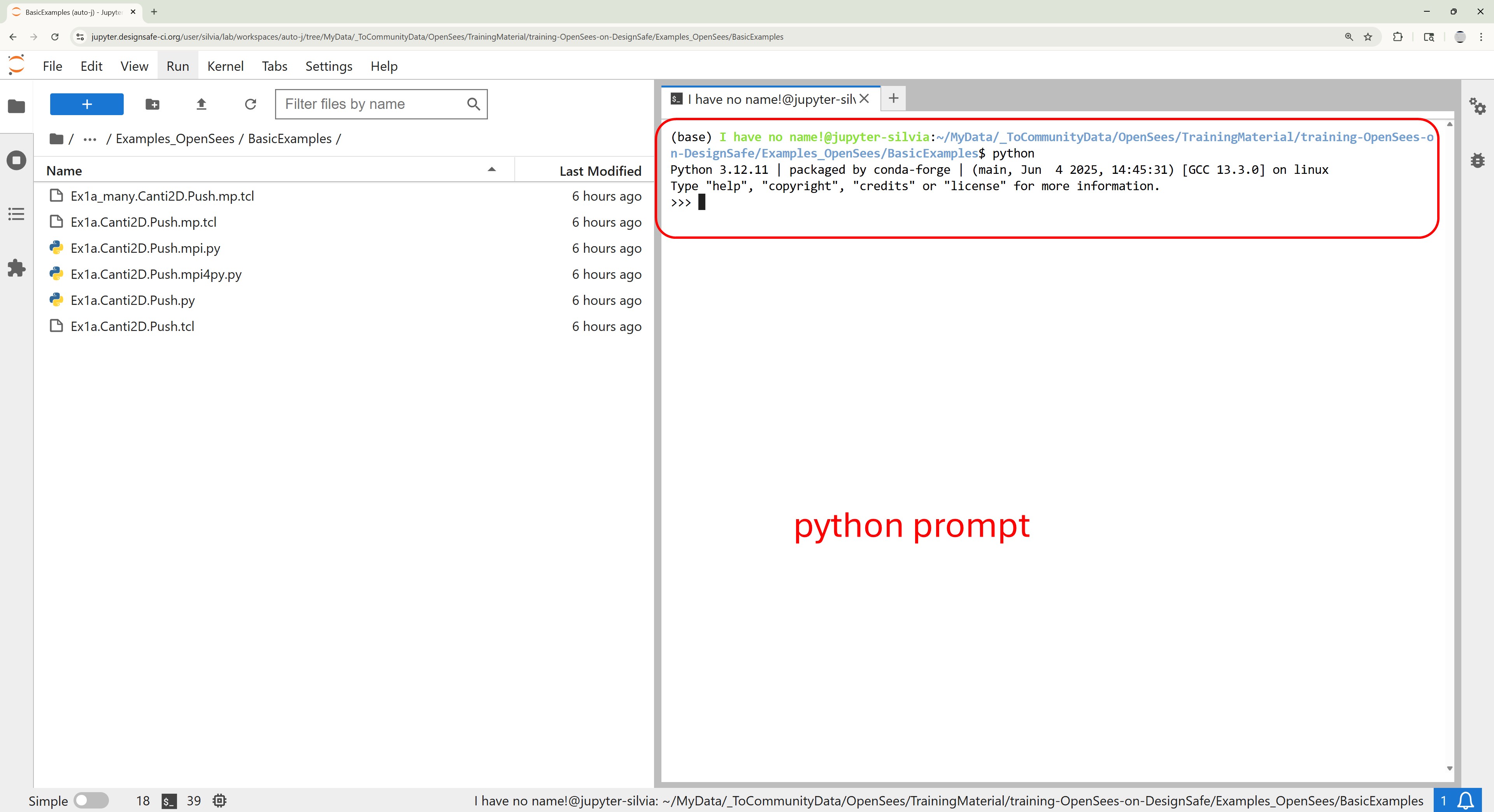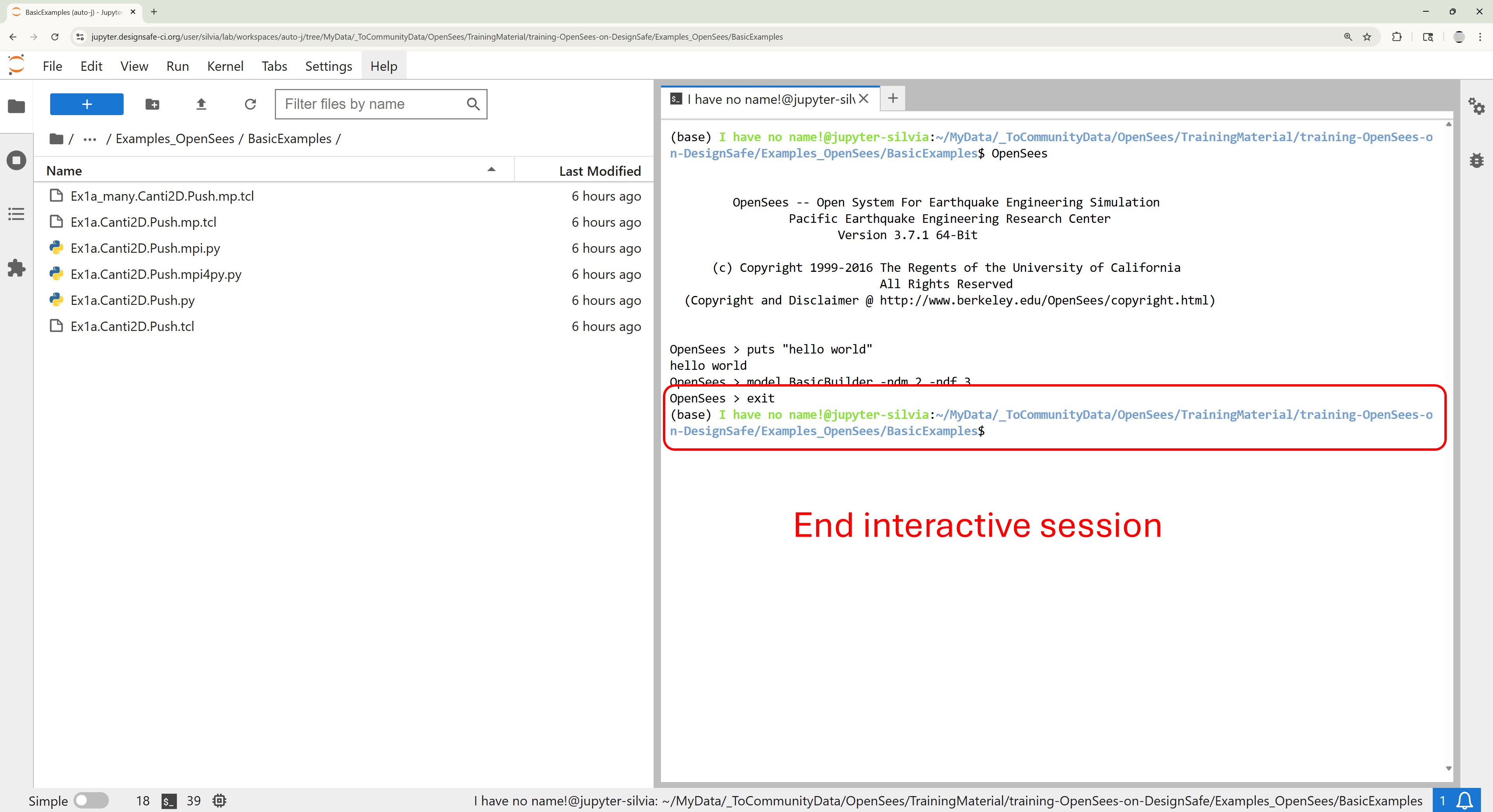 Starting interactively also helps you get comfortable with the prompt and experiment with simple commands one at a time. This is especially helpful when learning OpenSees or troubleshooting a new environment.