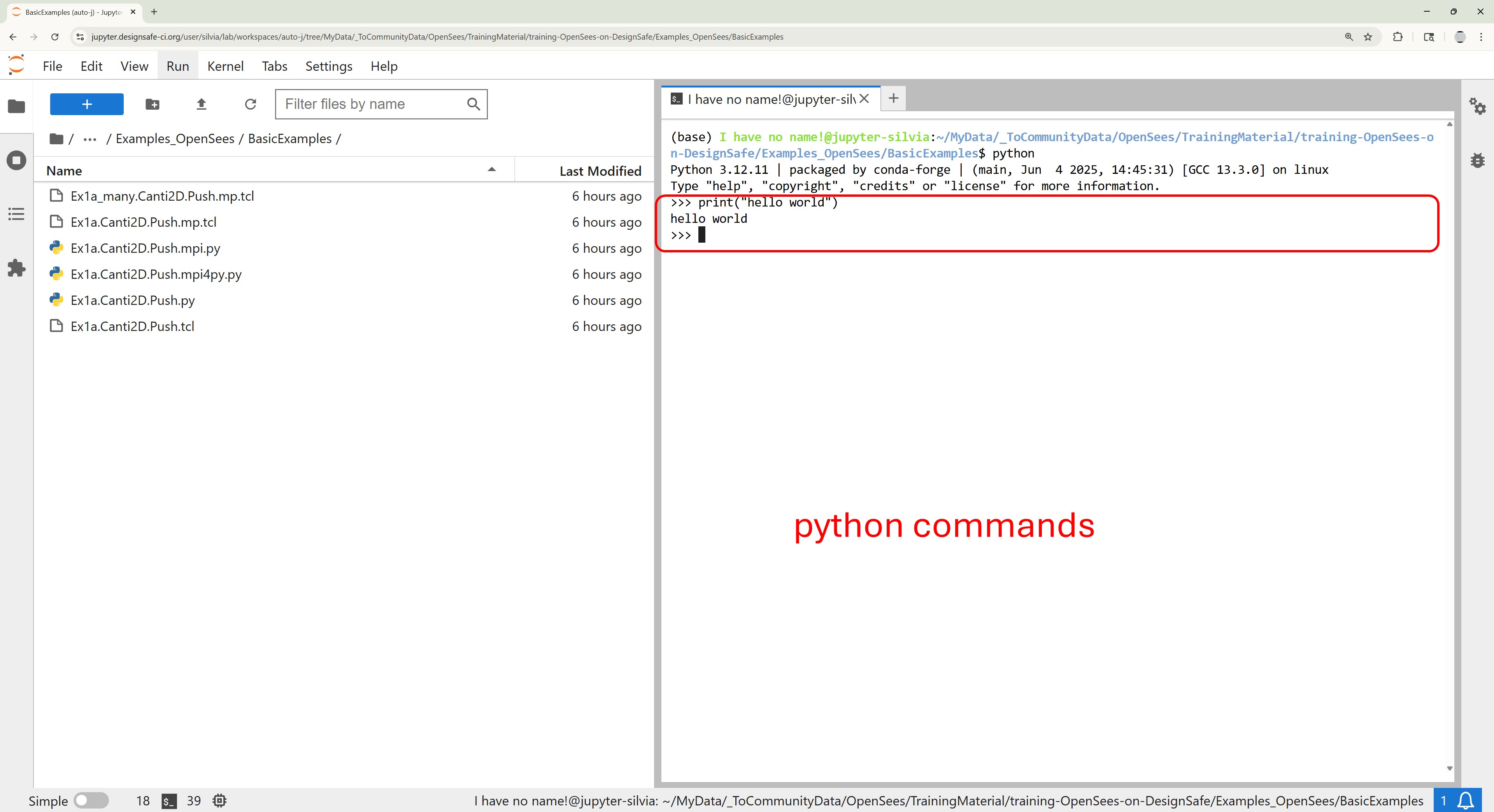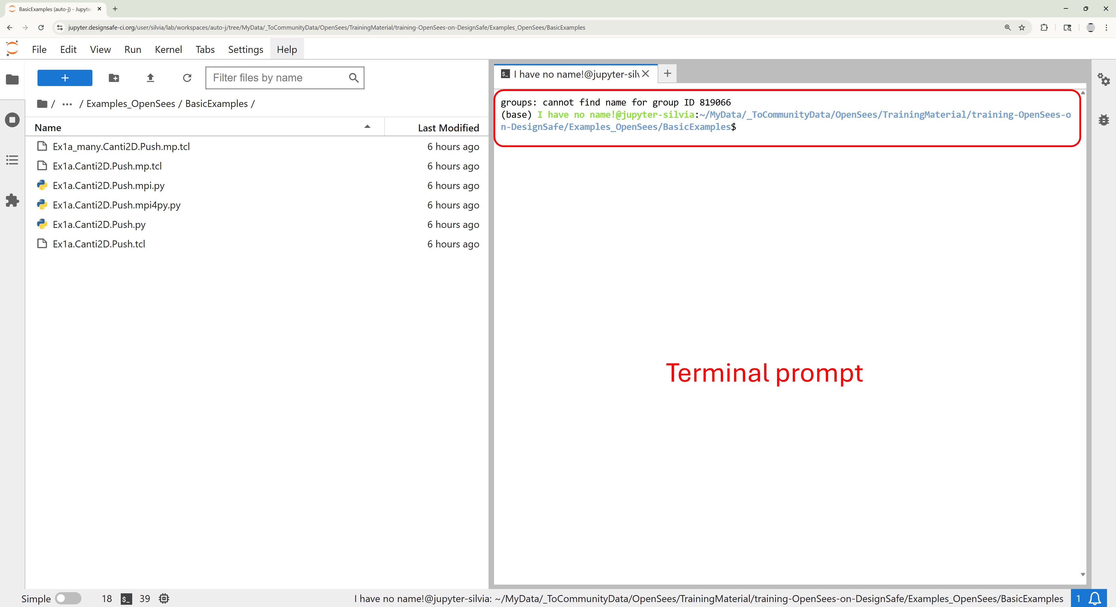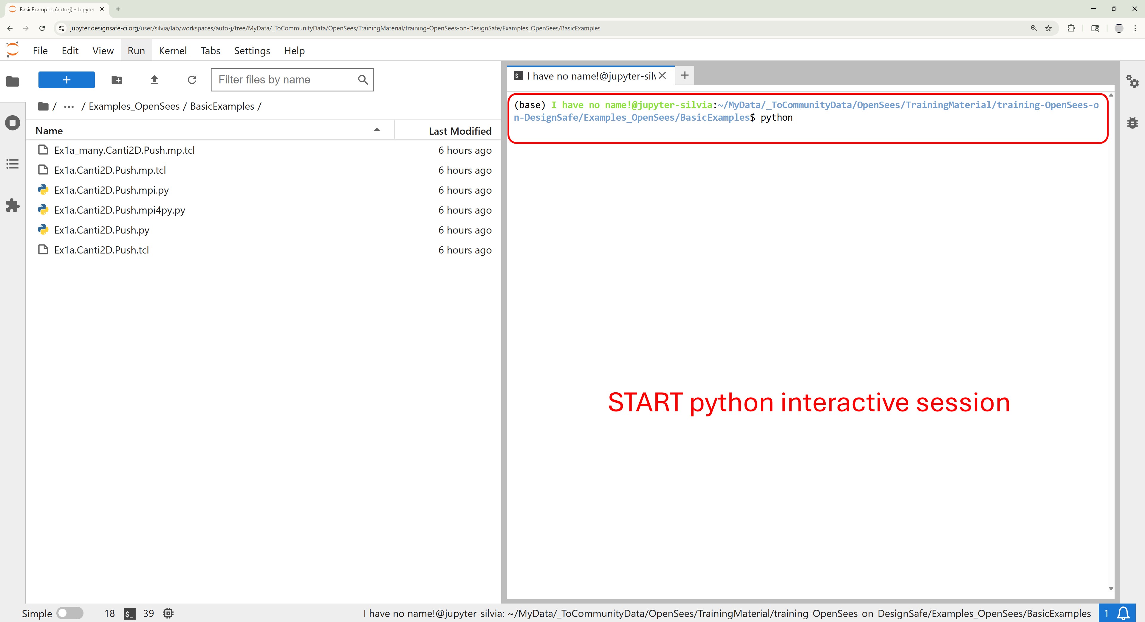 Starting interactively also helps you get comfortable with the prompt and experiment with simple commands one at a time. This is especially helpful when learning OpenSees or troubleshooting a new environment.