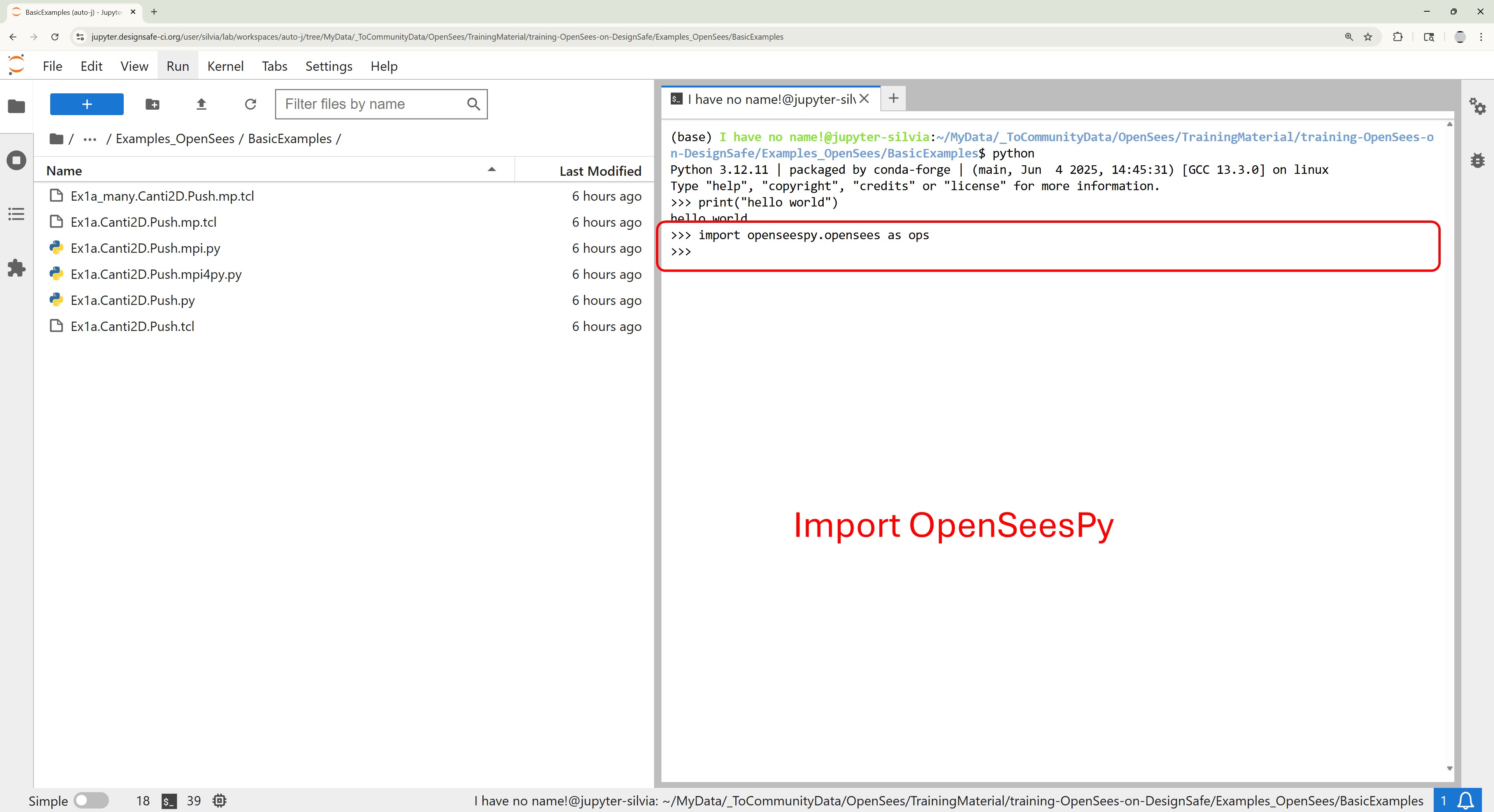 You can now enter your commands at the prompt, one at a time, as shown below. You need to import OpenSeesPy before you can run OpenSees commands: