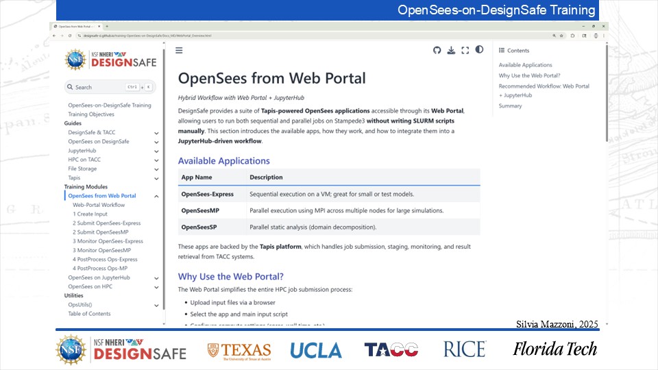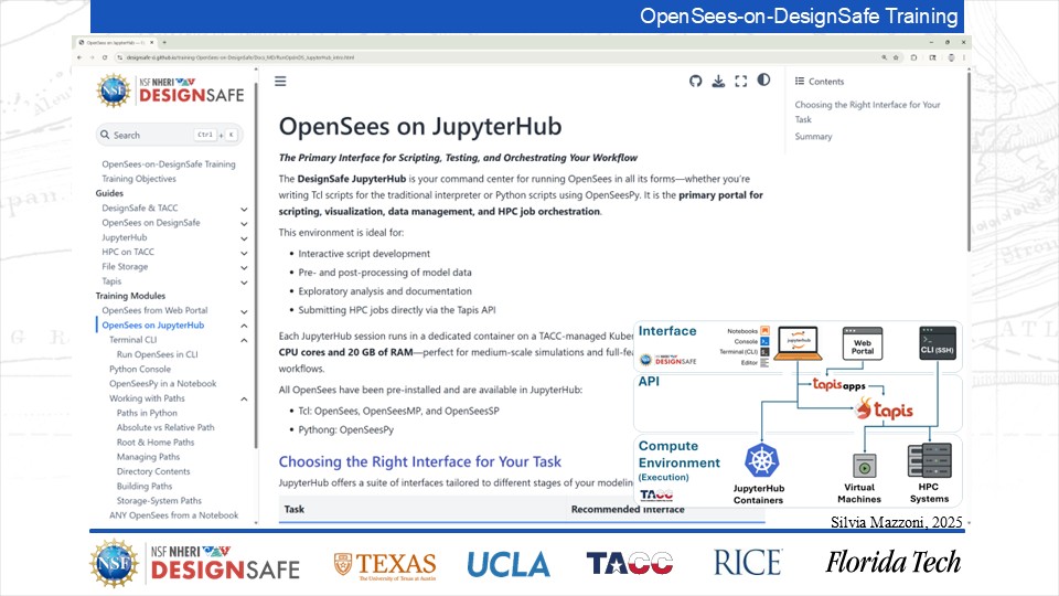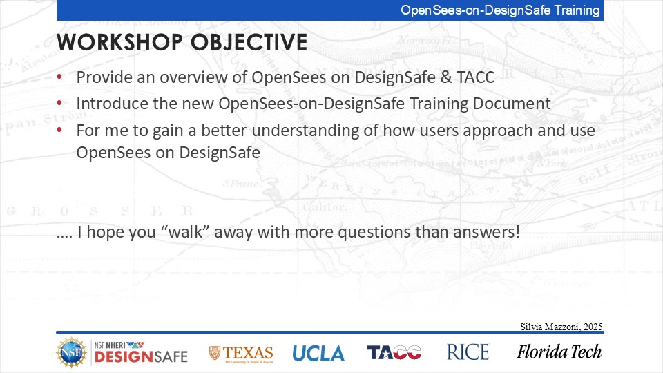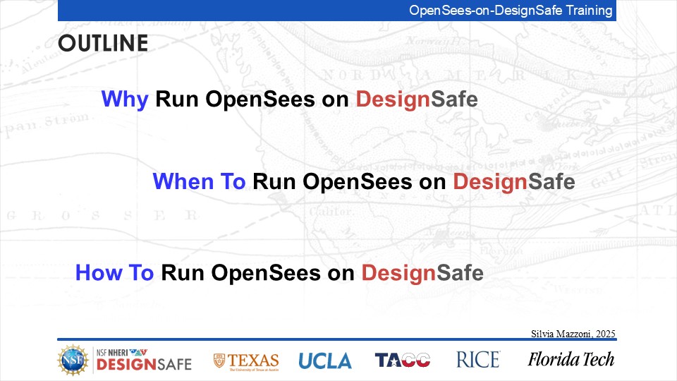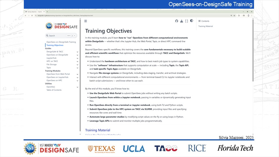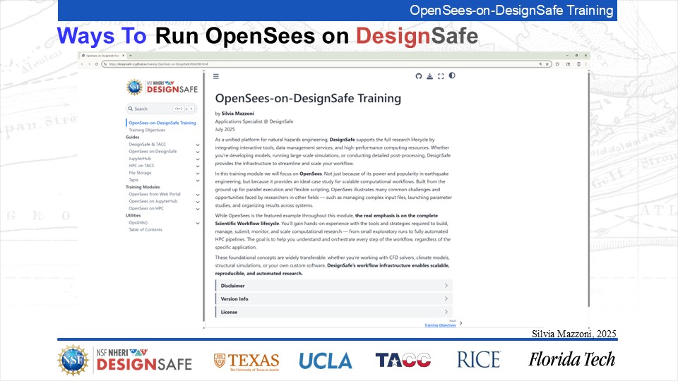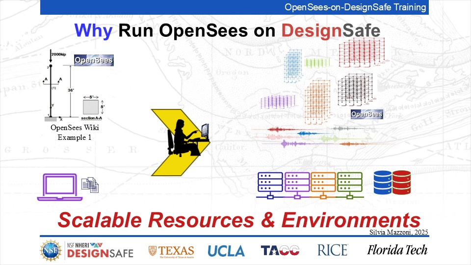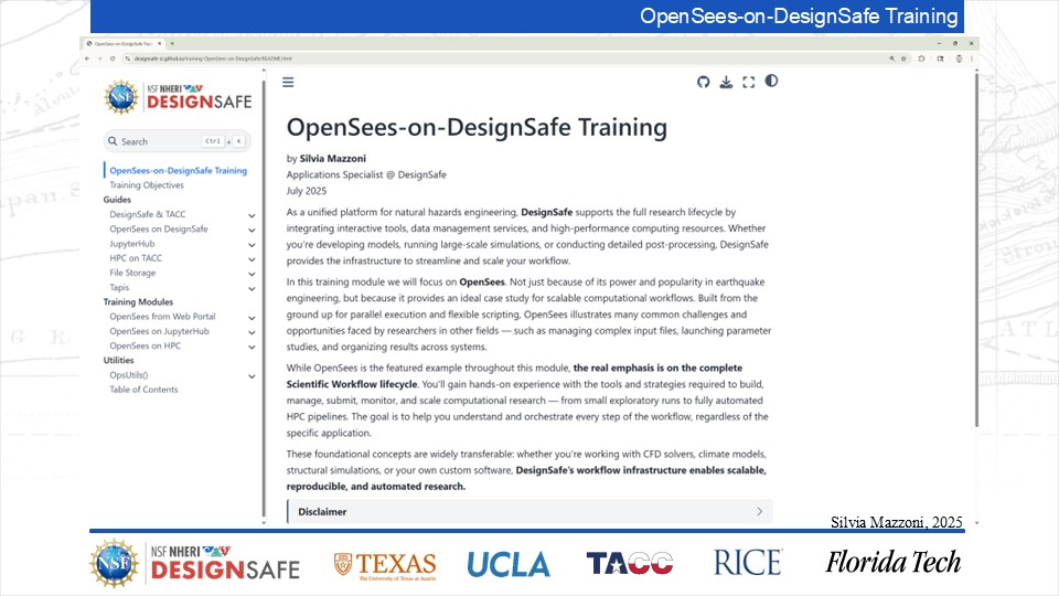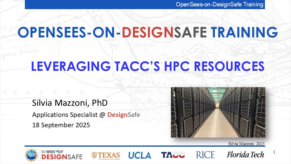 On September 17, 2025 we held a webinar introducing this training document. This webinar introduced DesignSafe as a unified platform for advancing natural hazards research, offering integrated tools for data management, interactive modeling, and high-performance computing. Using OpenSees as the primary case study, participants explored how to design and scale computational workflows — from small exploratory runs to automated HPC pipelines. The session emphasized the complete scientific workflow lifecycle, including model setup, job submission, monitoring, and results management. While focused on earthquake engineering, the strategies presented are broadly transferable to other domains such as CFD, climate modeling, and structural simulation.