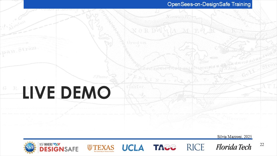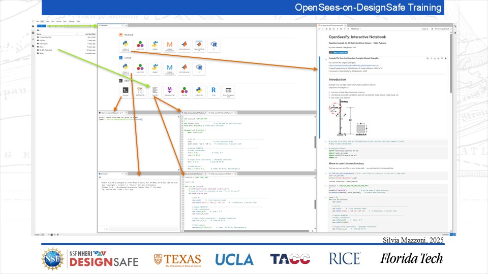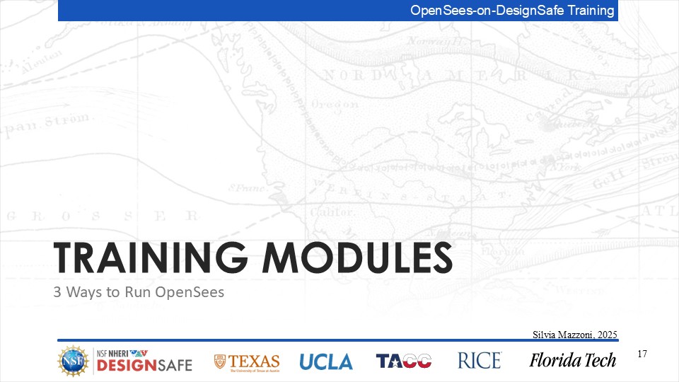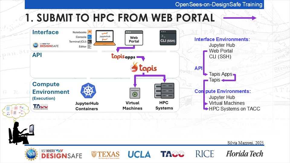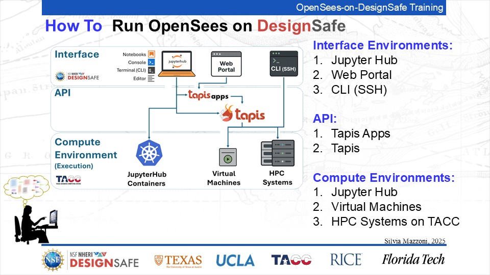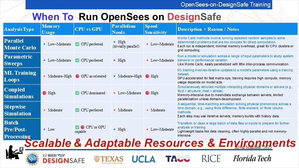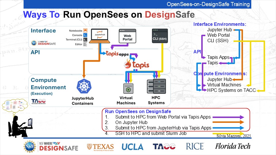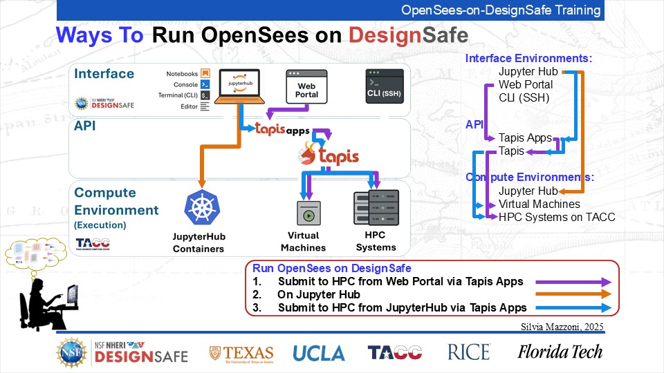 On September 17, 2025 we held a webinar introducing this training document. This webinar introduced DesignSafe as a unified platform for advancing natural hazards research, offering integrated tools for data management, interactive modeling, and high-performance computing. Using OpenSees as the primary case study, participants explored how to design and scale computational workflows — from small exploratory runs to automated HPC pipelines. The session emphasized the complete scientific workflow lifecycle, including model setup, job submission, monitoring, and results management. While focused on earthquake engineering, the strategies presented are broadly transferable to other domains such as CFD, climate modeling, and structural simulation.