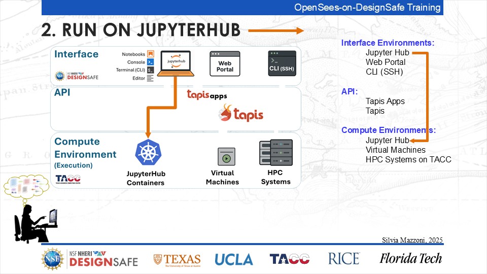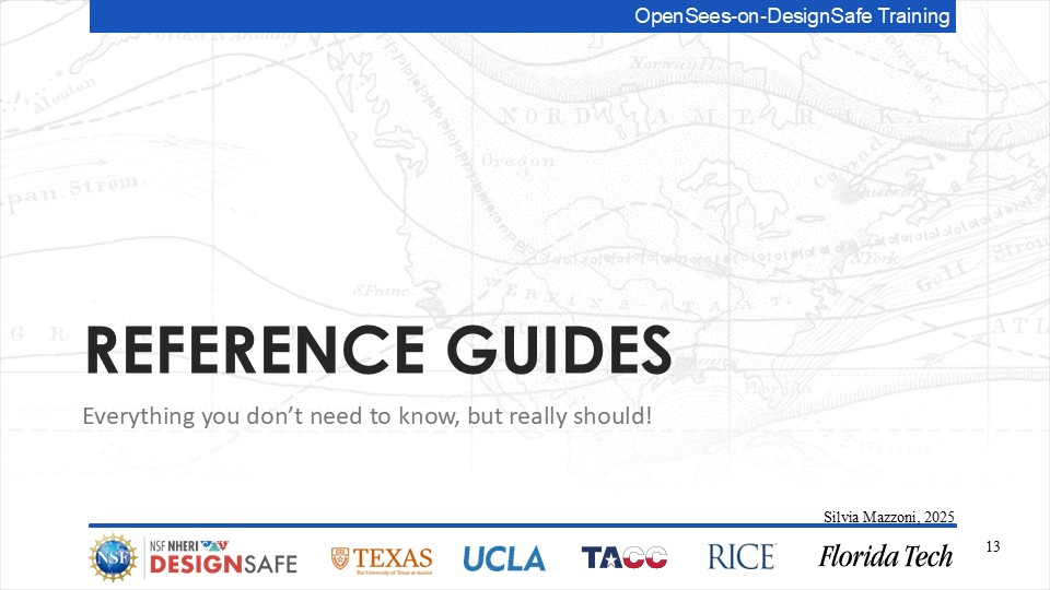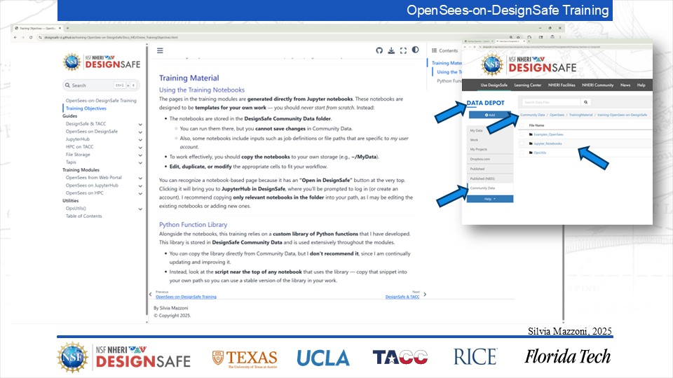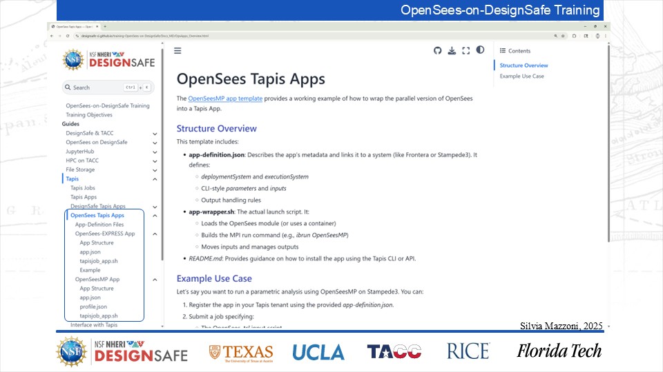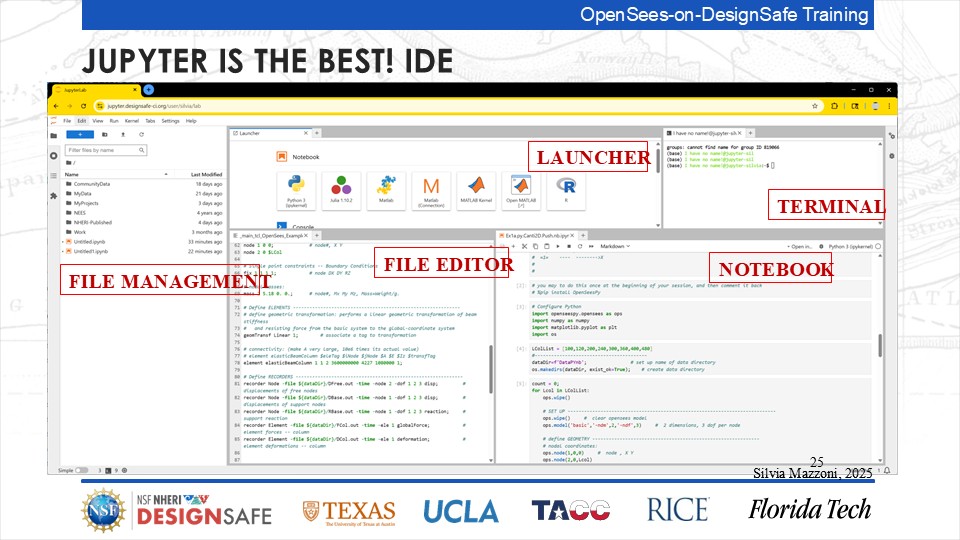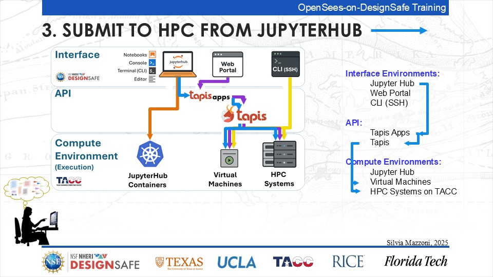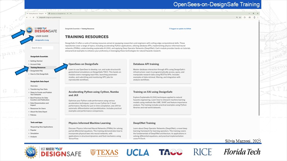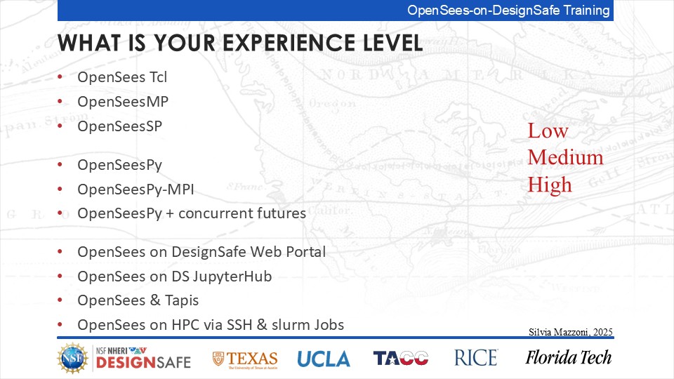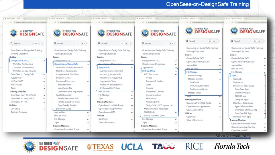 On September 17, 2025 we held a webinar introducing this training document. This webinar introduced DesignSafe as a unified platform for advancing natural hazards research, offering integrated tools for data management, interactive modeling, and high-performance computing. Using OpenSees as the primary case study, participants explored how to design and scale computational workflows — from small exploratory runs to automated HPC pipelines. The session emphasized the complete scientific workflow lifecycle, including model setup, job submission, monitoring, and results management. While focused on earthquake engineering, the strategies presented are broadly transferable to other domains such as CFD, climate modeling, and structural simulation.